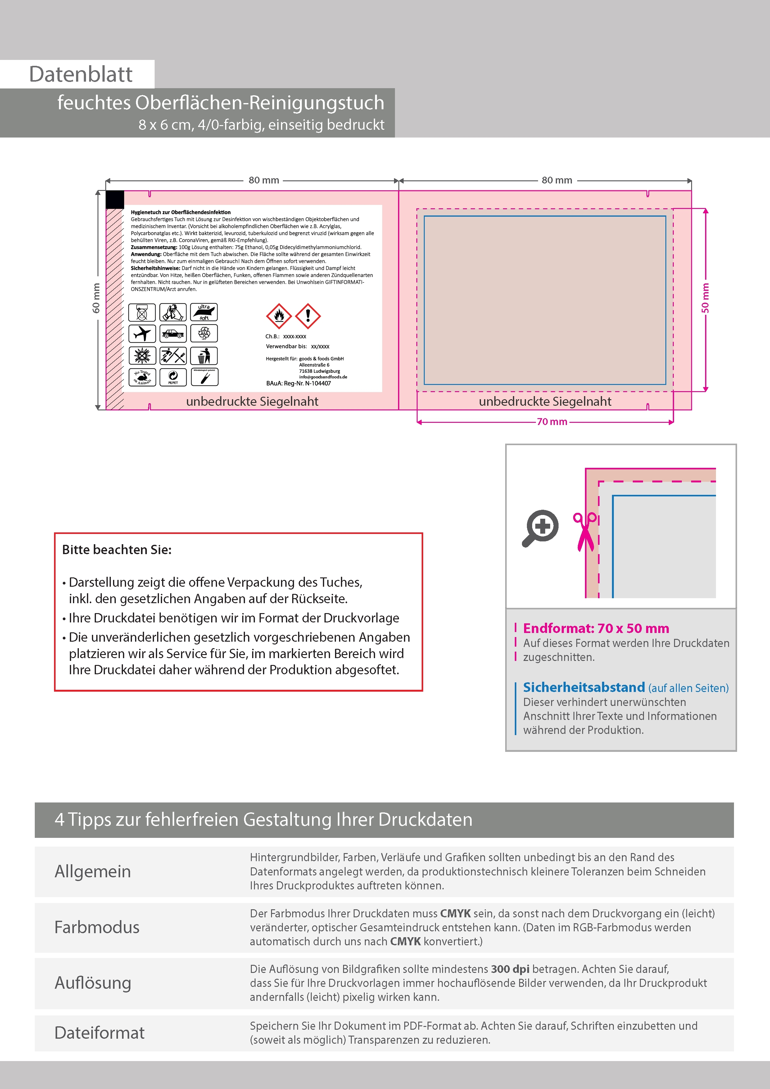 TOPSELLER: Feuchtes Oberflächen-Reinigungstuch, 8 x 6 cm, 4/0-farbig einseitig bedruckt